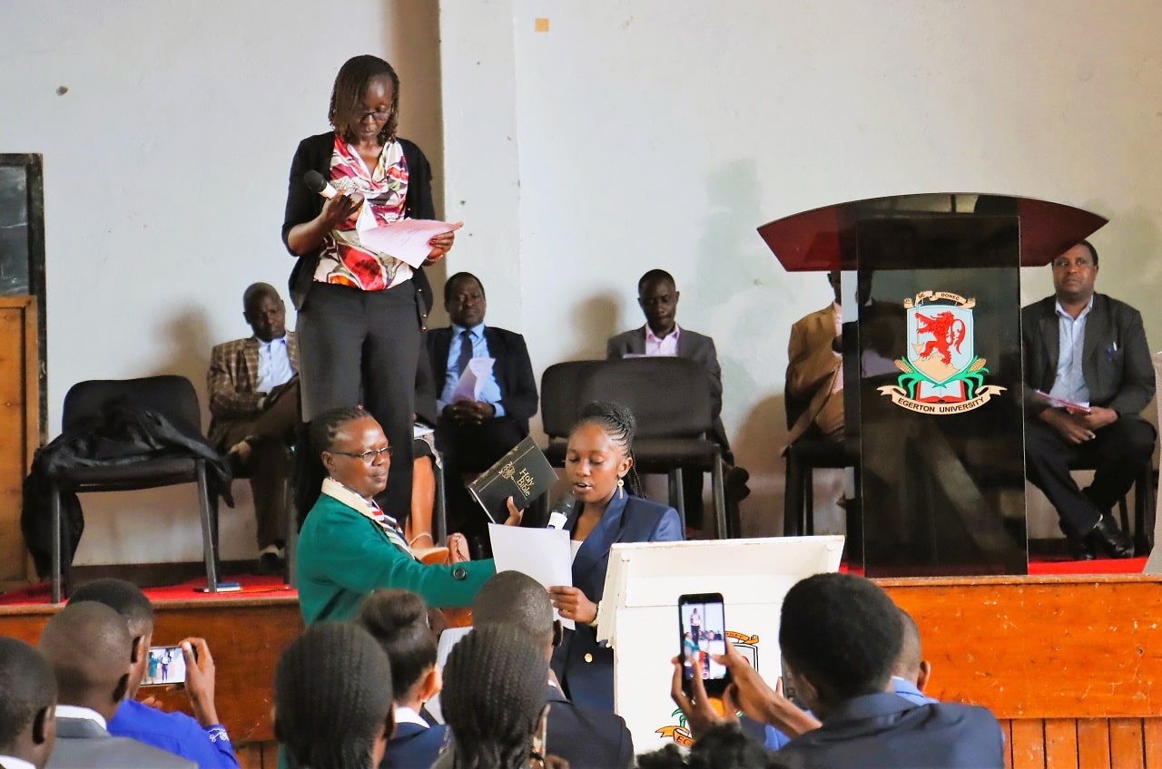 It is 8.30 am Friday Morning. Egerton University is swearing in new student leaders in a ceremony witnessed by University Management, led by Vice Chancellor Prof. Isaac Kibwage, at Kilimo hall, Njoro Main Campus.