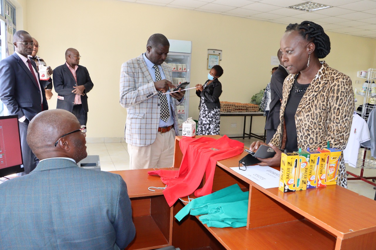 Ms Esther Wabuge buying Egerton University branded merchandise from the Minimart at the Main Entrance in Main Campus.University Council Member Ms Esther Wabuge said that the Council had a vision of establishing IGUs and that the opening of the minimart is a step towards their goal of increasing and diversifying University income. She added that all IGUs should embrace cashless payment services, especially the use of till numbers instead of the pay bill option, to attract more customers, particularly the students. In his response, the Director IGU, Prof. George Owuor, said that the Directorate was targeting to adopt diversified cashless payment options by the end of 2022 in all its IGUs. Dr Wilson Ronno, a Council Member, added that through IGUs, Egerton University has an avenue to commercialize its innovations, therefore, making them easily accessible to the market.