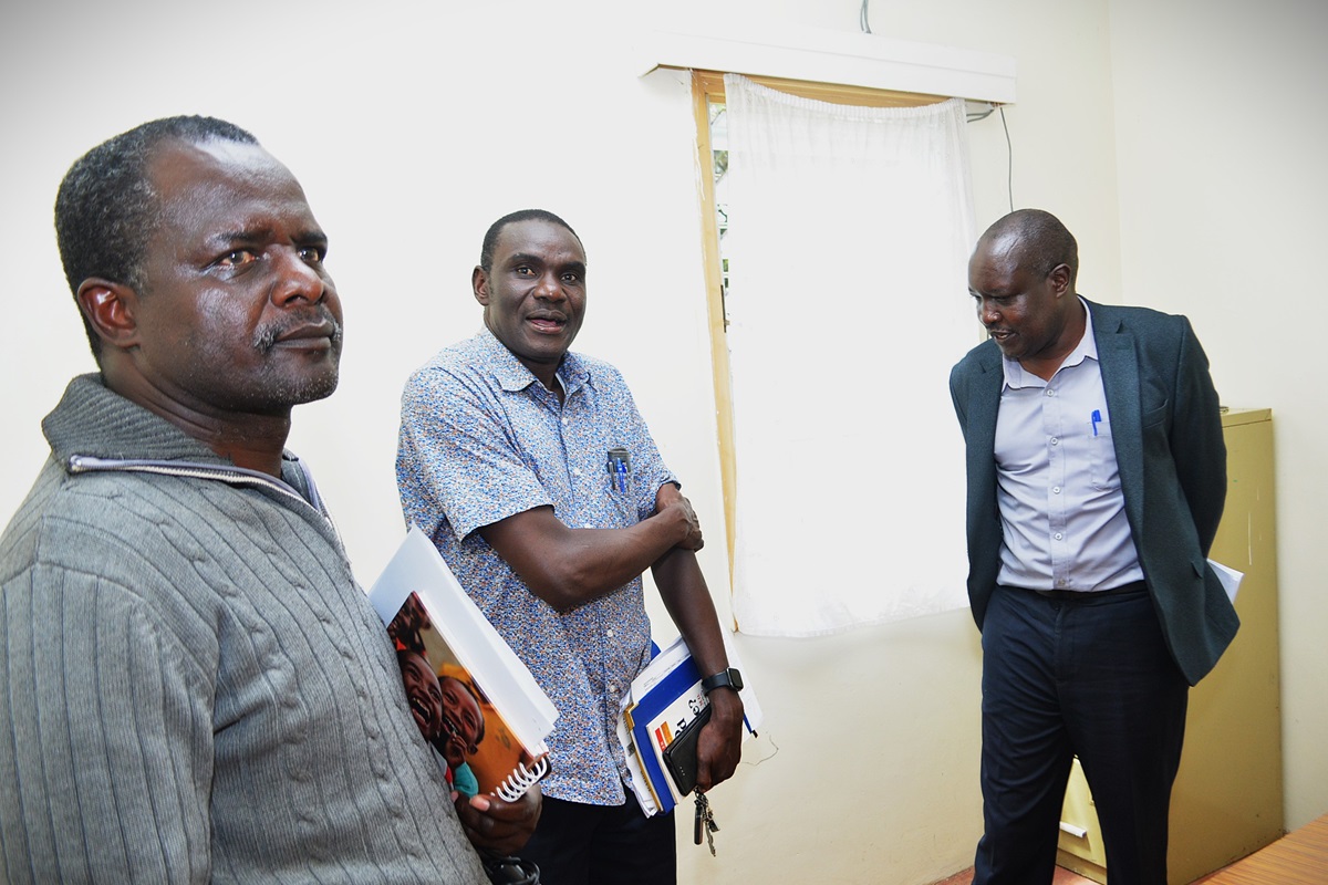 Prof. George Owuor (left) hands over leadership tools to Prof. Julius Kipkemboi (right) as the new Director of Income Generating Units (IGUs) at Egerton University on June 27,2025, in the presence of IGU staff during a handover ceremony at the IGU Office. The transition marks a continued commitment to enterprise, accountability, and innovation. (Photo: Kurian Musa/Egerton University)