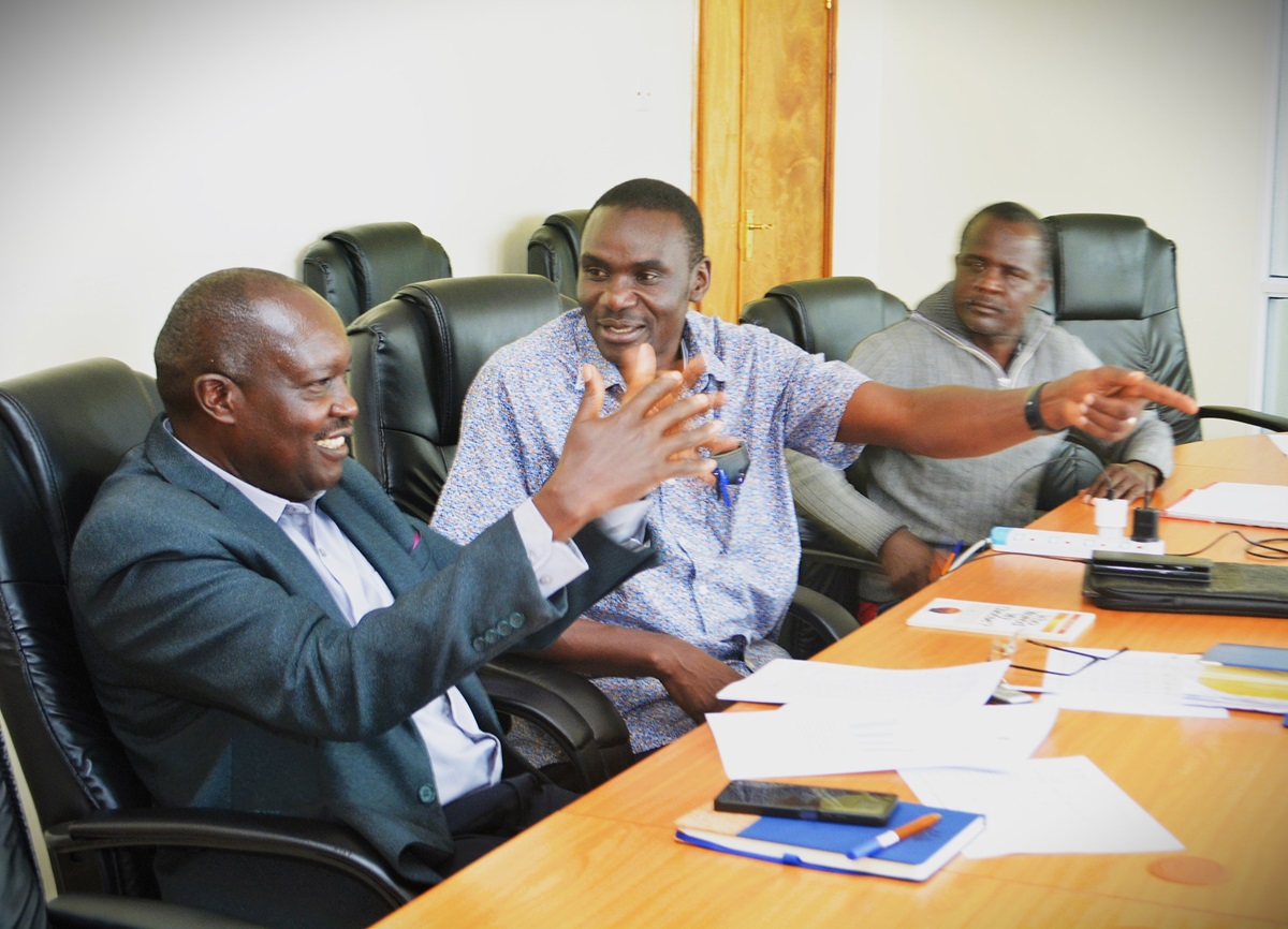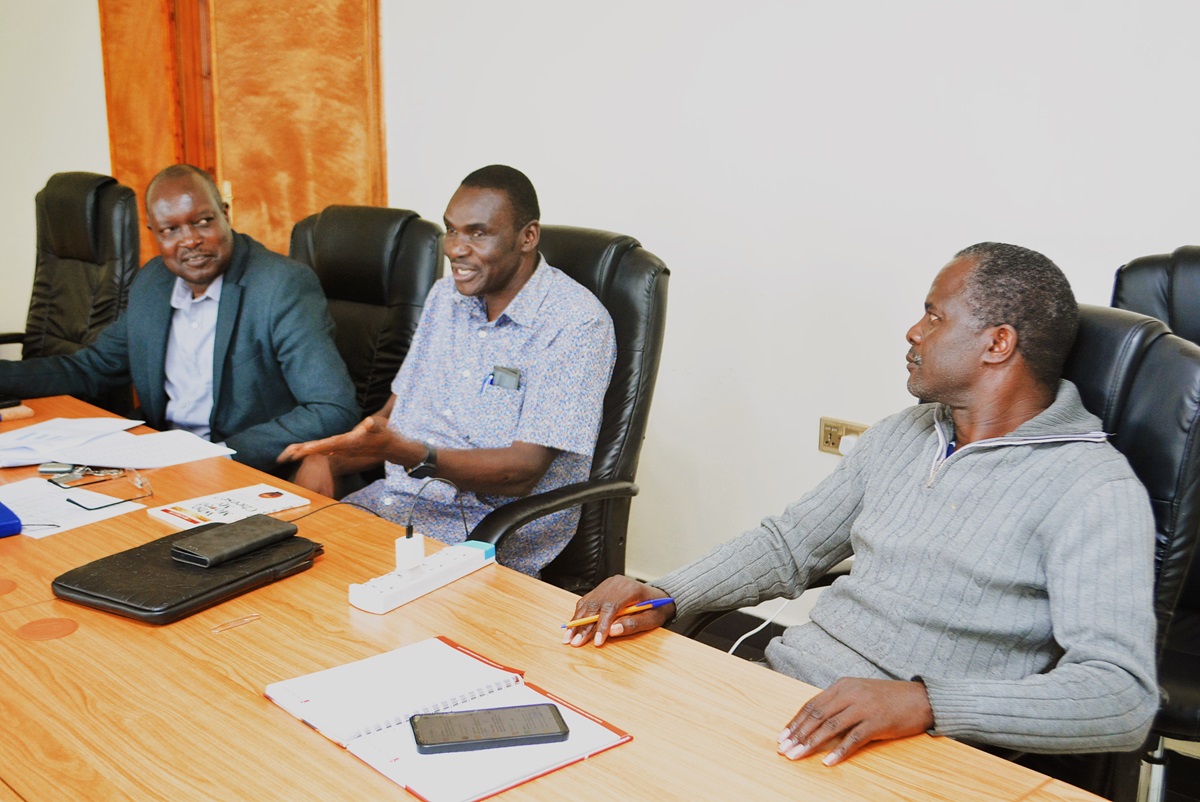 Prof. George Owuor (left) and Prof. Julius Kipkemboi (right) share a light moment during the handover meeting at the IGU Office on June 27,2025. The outgoing and incoming Directors reaffirmed their commitment to collaboration and continuity in driving Egerton University's income-generating agenda.(Photo: Kurian Musa/Egerton University)