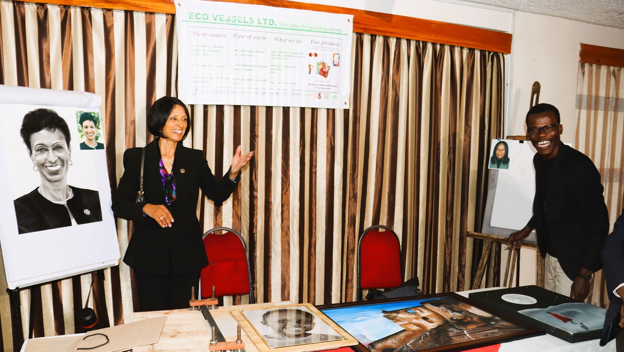 The President of Bowie University was taken to an exhibition of innovations within the University and got a portrait of herself drawn through by pencil using a device innovated by one of the students.