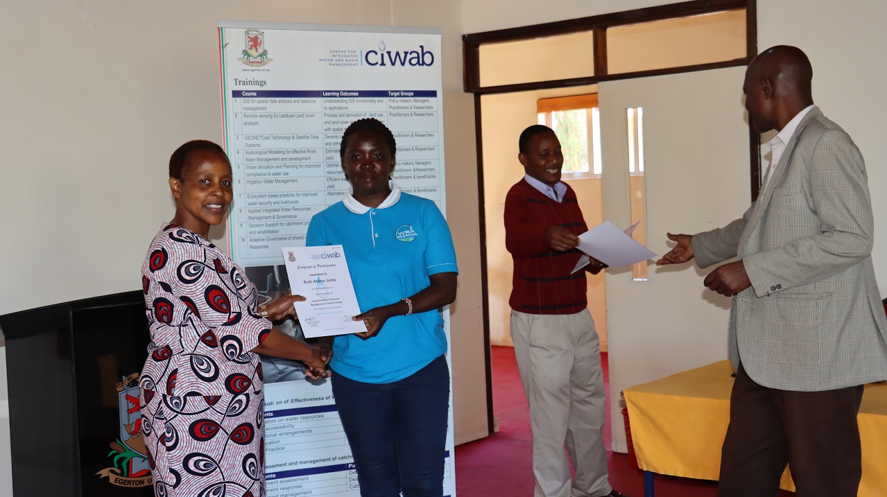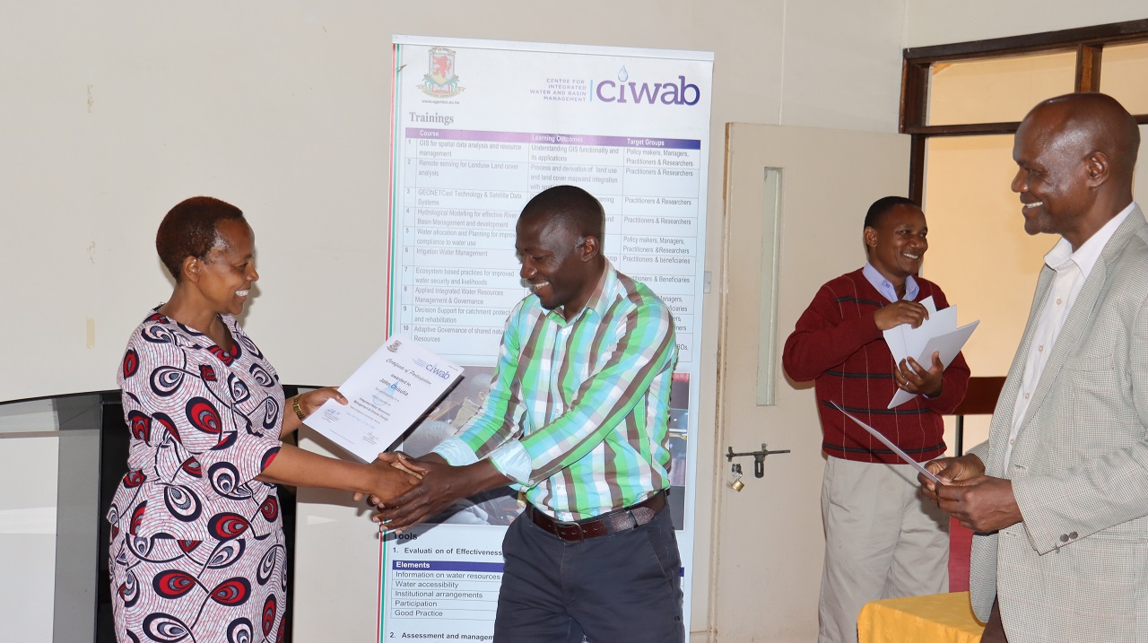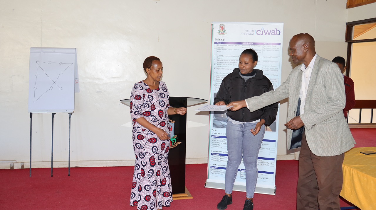 The Director of Research and Extension Prof Nancy Mungai officiated the closing ceremony where certificates of participation in the two weeks training facilitated by Dean Faculty of Engineering Prof. Japheth Onyando in aegis of CIWAB.